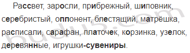Ра (с, сс)вет, зар..сли, пр..брежный, ш..повник, с..р..бристый, о(п, пп)онент, бл..стящий, м..трёшка, ра..писали, с..р..фан, пл..точ..к, к..рзинка, уз..лок, д..р..вя(н, нн)ые, игрушки(сув..ниры).