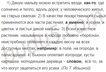 1) Дикую мальву можно встретить везде где солнечно и тепло вдоль дорог у человеческого жилья на старых свалках. 2) В качестве лекарственного сырья применяются все части растения и корни и цветки и листья дикой мальвы. 3) Всем известное растение называемое в народе любовно «берёзка» неистребимо появляется каждую весну на всех доступных местах в поле на огороде в палисаднике. 4) Вьюнок оплетает изгороди кусты картошки молоденькие деревца всё то за что могут зацепиться его усики. (По Т. Ильиной)