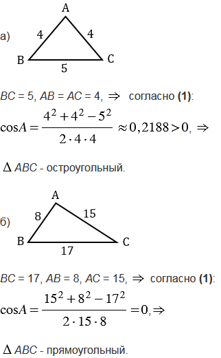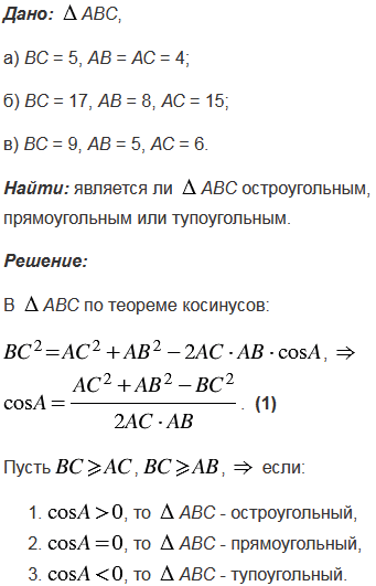 Выясните, является ли треугольник остроугольным, прямоугольным или тупоугольным, если его стороны равны: а) 5, 4 и 4; б) 17, 8 и 15; в) 9, 5 и 6.